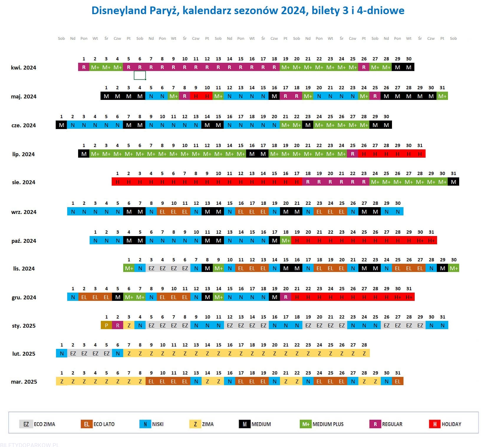 Bilet 4 DNI / 2 PARKI jest datowany. Przy rezerwacji należy wybrać rodzaj biletu w zależności do sezonu (patrz kalendarz poniżej) oraz podać planowany pierwszy dzień wstępu do parku. Cena biletu zależy wyłącznie od koloru pierwszego dnia pobytu w parku! Dni wstępu muszą być jeden po drugim.